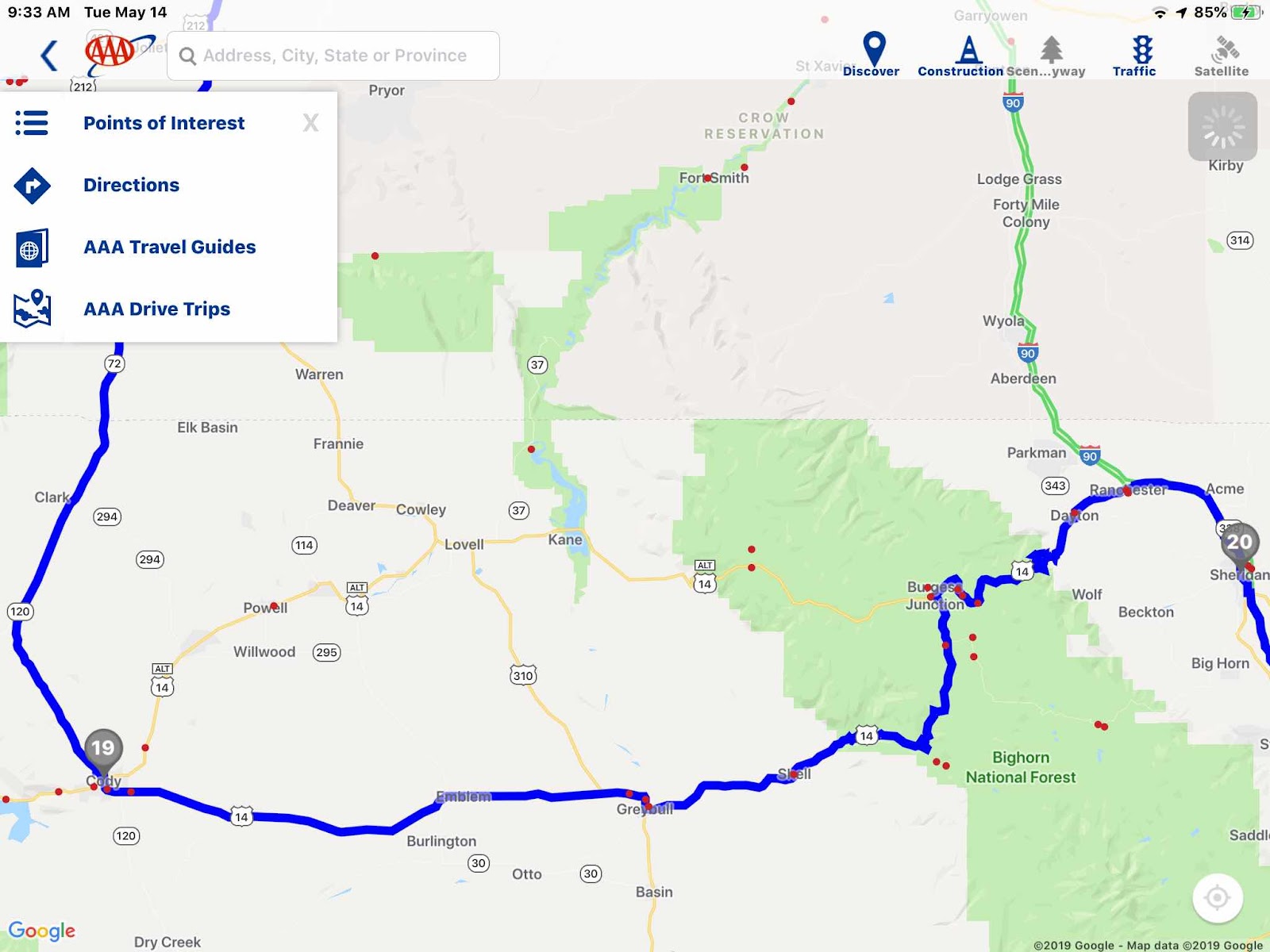 Today is another story. Tom hooked up in the cold and rain while I did the dog walks and secured the inside of the trailer (I had the easy part, for sure). We were on the road by 10:30 with only a 140-mile drive ahead of us. We saw the weather prediction for the most direct route and knew that we might be hitting some snow in the high passes of the Bighorn Mountains on US-14 between Cody and Sheridan. Three miles out of Cody, we started to see snow buildup on the ground and the hilltops, although the temperature raised up to near 50 degrees and we could no longer see any snow on the roadsides. It was beautiful for the first 70 miles of the drive.